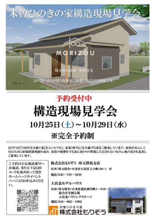 見学会 木曾ひのき平屋の家 完成見学会 開催日時: 2025年10月25日(土)~2025年10月29日(水) 10:00~17:00 開催場所:埼玉県行田市 木曾ひのき平屋の家 完成見学会のお知らせ 埼玉県行田市にひのきの香り漂う平屋の家が完成します。 平屋ながら大空間の吹抜けと階段を上がった先に5帖の小屋裏収納、 最近少なくなってきた本格和室と見所満載の邸宅です。 本物の木を使い、自然素材の珪藻土塗壁仕様の健康的で常に快適な もりぞうの家を是非ご見学してみて下さい。 このイベントに参加する PREV 一覧に戻る NEXT 見学会 木曾ひのき体験ツアー 相談会