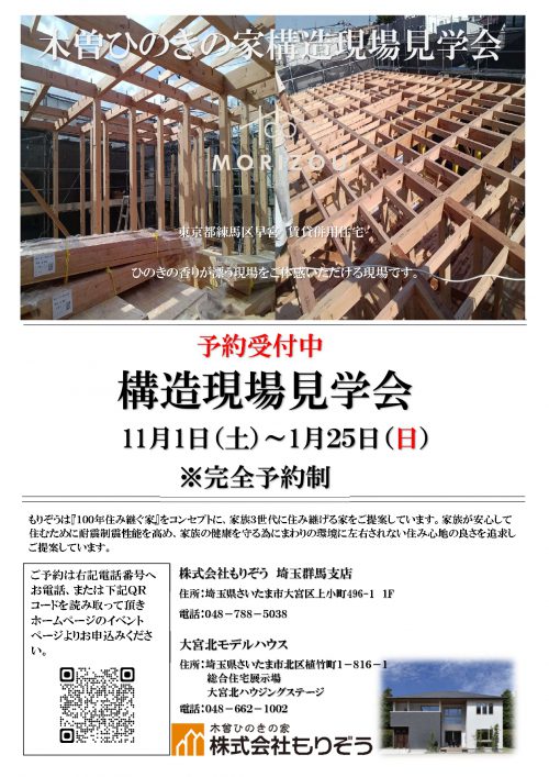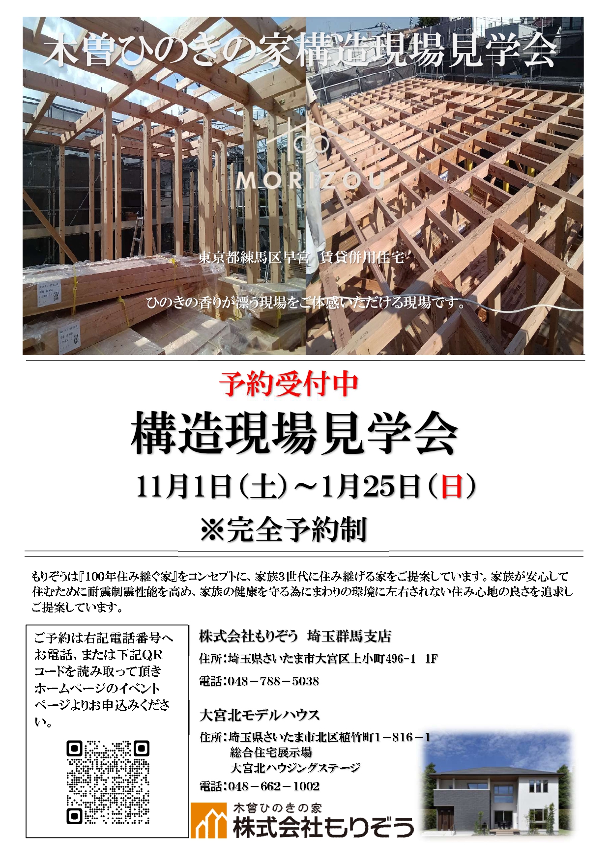 見学会 都内で建てる賃貸併用住宅 構造見学会 開催日時: 2025年11月1日(土)~2026年1月25日(日) 10:00~17:00 開催場所:東京都練馬区 都内で建てる賃貸井併用住宅のご案内 昨今の建築資材や人件費、様々な物価が上昇し住宅価格も高騰しております。 せっかく土地があっても建築費の高騰で注文住宅を諦めている方も多いのでは? 今回は賃貸併用住宅にし賃貸収入で住宅ローン分を家に稼いでもらいます! どういったスキームを立てればよいのかもアドバイスします! もりぞうの賃貸併用住宅は木曽ひのきで作り、断熱も外張り断熱で高付加価値な 賃貸併用住宅になります。 東京ゼロエミ水準A取得可能で補助金ももらえるかも。 まずはどんな作りなのか、構造現場をお確かめ下さい!! なります。 このイベントに参加する PREV 一覧に戻る 見学会 木曾ひのき体験ツアー 相談会