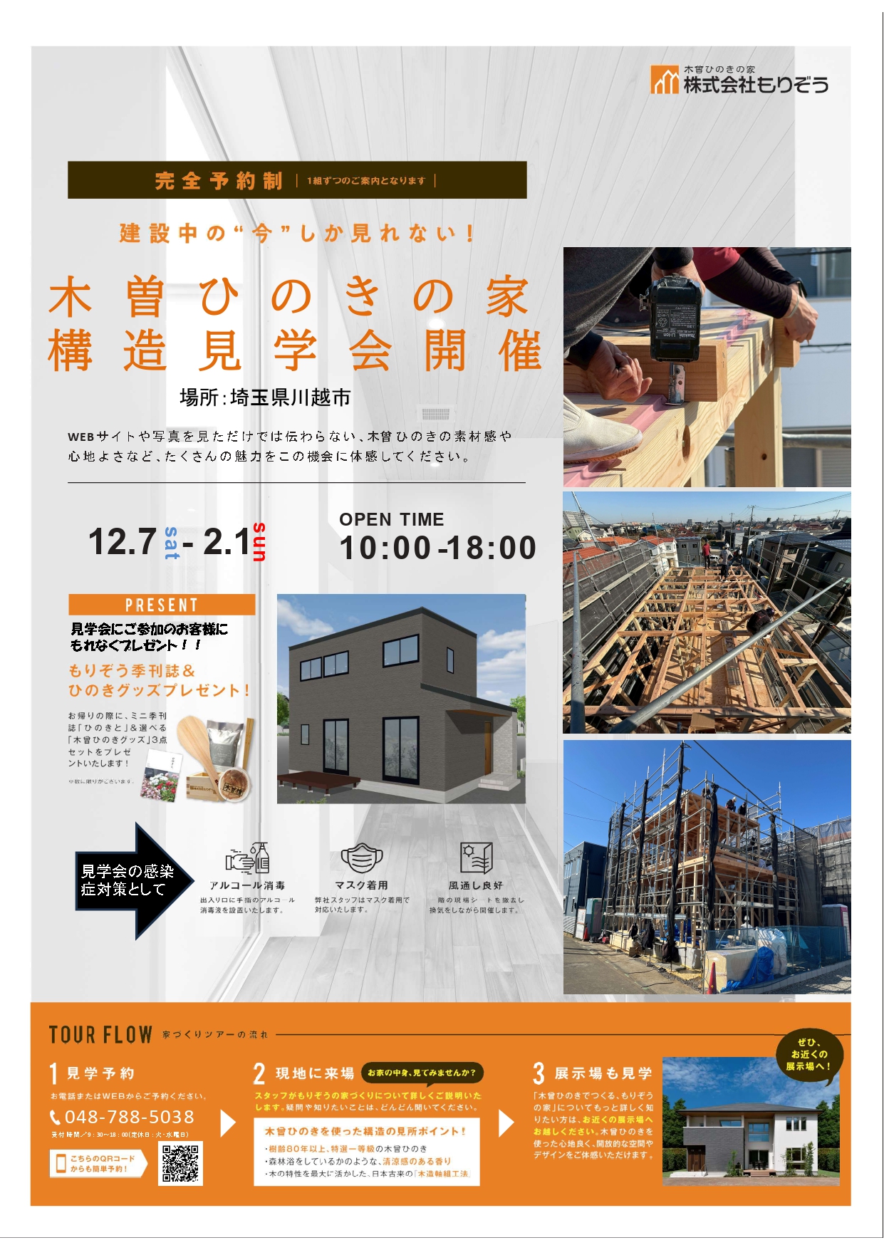 見学会 新商品「ひのきばこ」構造見学会 開催日時: 2025年12月7日(土)~20265年2月1日(日) 10:00~17:00 開催場所:埼玉県川越市 新商品「ひのきばこ」構造見学会開催 埼玉県川越市に木曽ひのきの家が上棟しました。 若いご夫婦のご自宅で家事導線や利便性・デザインも拘って 家づくりを楽しまれました。 そんなお二人の大切なご自宅の建築中現場をご見学頂けます。 外張り断熱に基礎断熱、自然素材をふんだんに使ったもりぞうの家。 是非、貴重な構造見学にいらしてください。 このイベントに参加する PREV 一覧に戻る NEXT 見学会 木曾ひのき体験ツアー 相談会