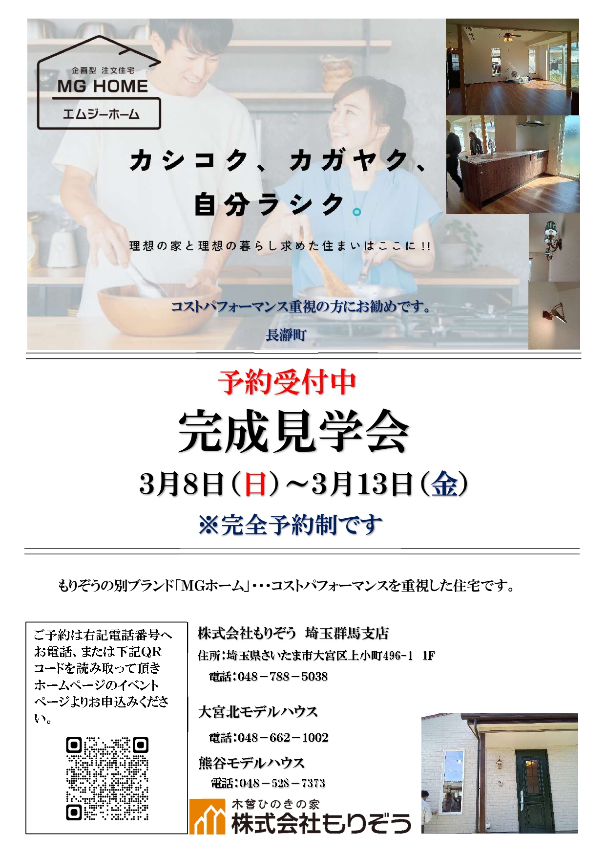 見学会 平屋完成見学会 開催日時: 2026年3月8日(日)~3月13日(金) 10:00~16:00 開催場所:埼玉県秩父郡長瀞町 もりぞうの別ブランド「MGホーム」完成 コストパフォーマンス重視のMGホームです。是非ご体感ください。 このイベントに参加する PREV 一覧に戻る NEXT 見学会 木曾ひのき体験ツアー 相談会